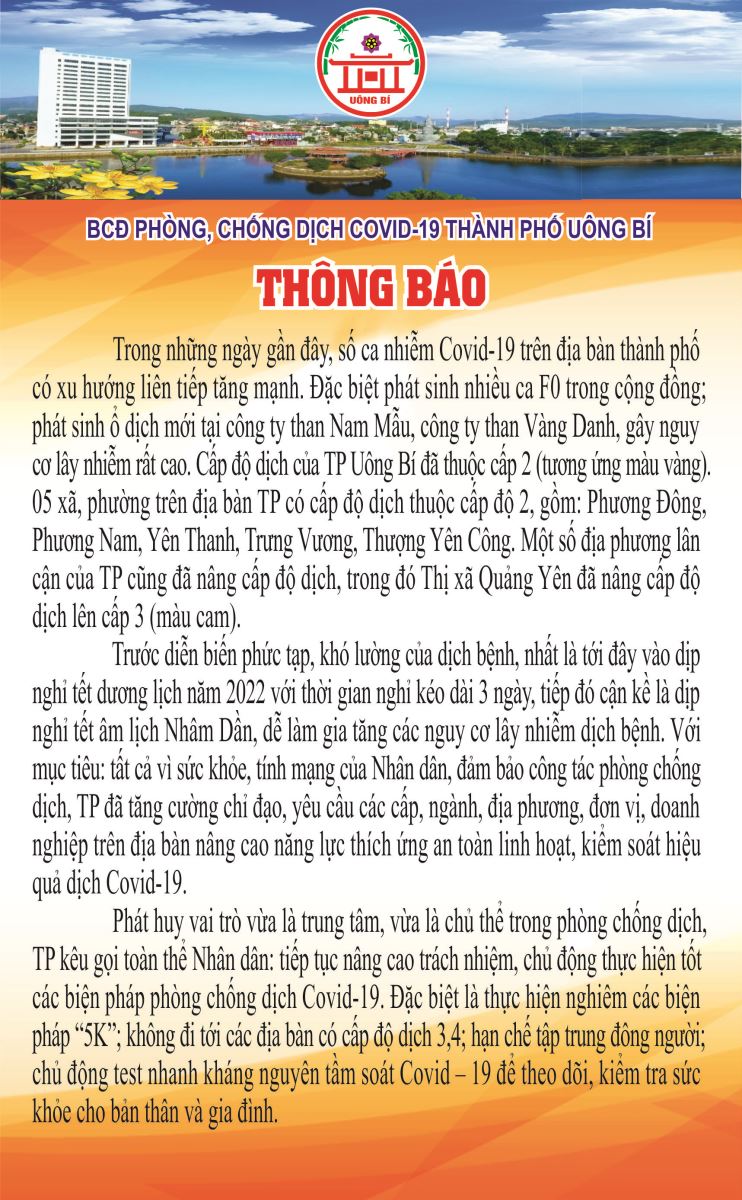 Thông báo của Ban Chỉ đạo phòng, chống dịch COVID-19 thành phố Uông Bí ngày 31/12/2021