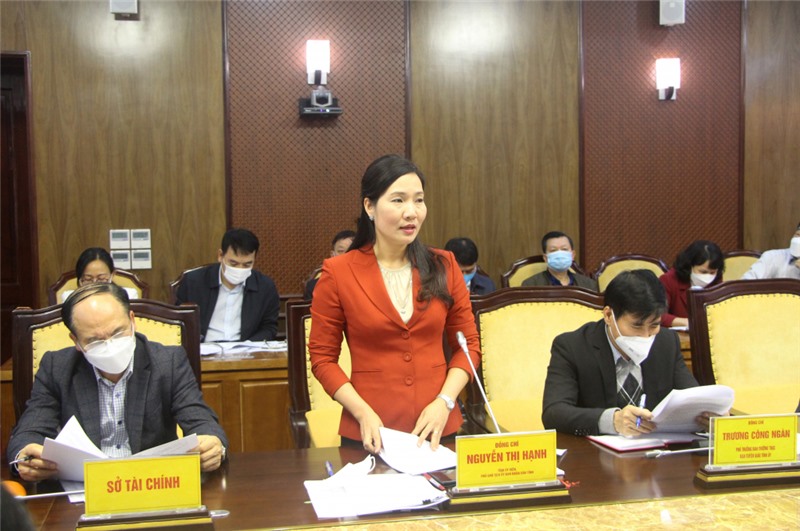 Đồng chí Nguyễn Thị Hạnh, Phó Chủ tịch UBND tỉnh báo cáo tại cuộc họp.