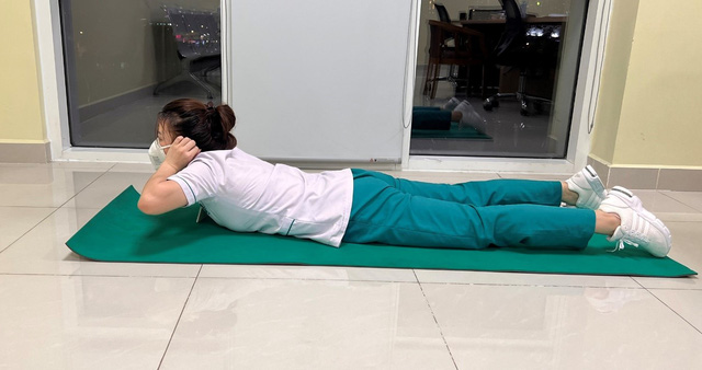 Đưa hai bàn tay lên phía hai tai như hình minh họa, hai chân vẫn phải giữ cố định ở sàn nhà. Bắt đầu ưỡn lưng lên, rồi từ từ hạ lưng xuống. Thực hiện động tác này từ 10 đến 15 nhịp mỗi lần, sau đó nghỉ ngơi trong 01 phút, và lặp lại 5 lần như thế. Bài tập này sẽ làm săn chắc các cơ ở vùng lưng.
