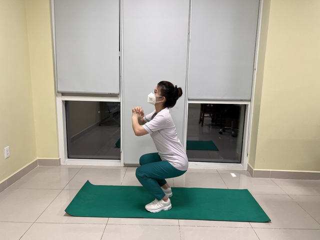 Đưa hai chân rộng bằng vai, hai bàn chân hướng ra phía bên ngoài một ít. Sau đó bắt đầu hạ người xuống như hình minh họa một cách chậm rãi, cho đến khi khớp gối của chúng ta vuông góc, rồi bắt đầu đứng dậy. Trong toàn bộ quá trình tập, bàn chân và gót chân không được đi chuyển. Bài này chúng ta sẽ tập 15 nhịp mỗi lần, nghỉ ngơi trong 1 phút, và lặp lại 5 lần như thế. Mục tiêu của bài này nhắm đến các khối cơ ở vùng đùi và mông.