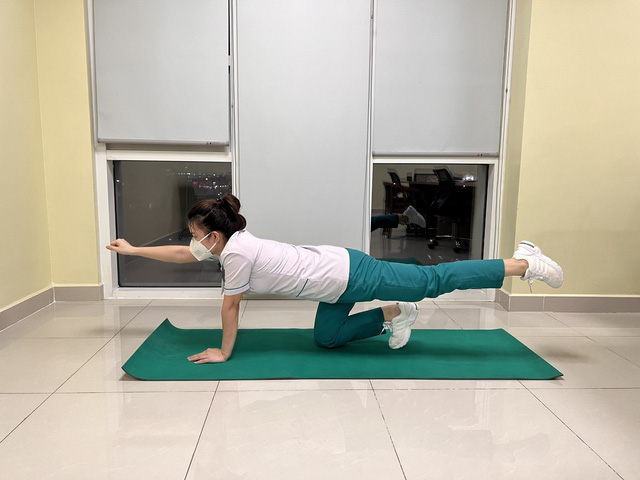 Chống tay và đầu gối đối bên như trong hình minh họa, sau đó nâng dần tới khi duỗi thẳng tay và chân còn lại. Thực hiện động tác này 30 nhịp một lần, nghỉ ngơi 1 phút, và lặp lại 5 lần như thế. Động tác này giúp làm săn chắc vùng eo, mông, và các khối cơ ở lưng.
