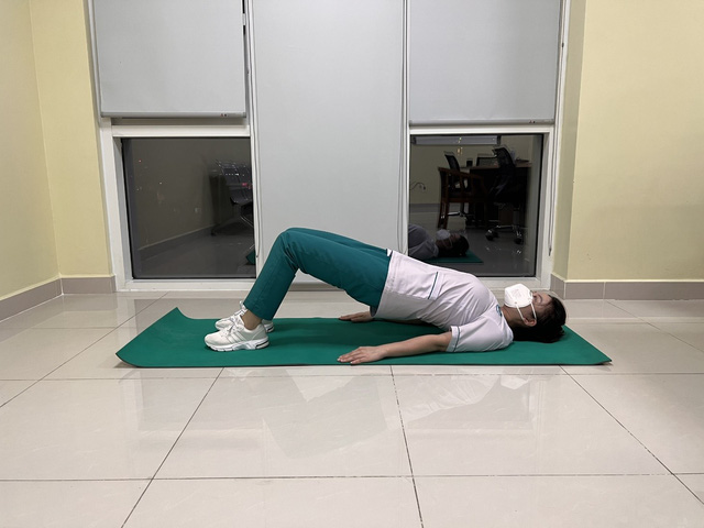Đặt hai bàn chân xuống sàn, khớp gối vuông góc, sau đó nâng hông lên cho đến khi lưng và đùi tạo thành một đường thẳng. Liên tục nâng lên hạ xuống vùng hông thành 15 nhịp/ lần, nghỉ ngơi 1 phút, lặp lại 5 lần. Bài tập này sẽ làm săn chắc các cơ ở vùng mông.
