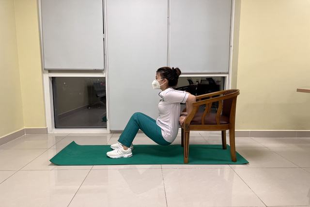 Đặt một chiếc ghế có 4 chân lên mặt sàn sao cho ghế không bị trượt trong quá trình tập luyện. Đứng ở trước ghế, đưa hai tay ra sau chống vào ghế như hình minh họa. Điểm đáng chú ý là khi hạ thấp thân mình, khuỷu tay phải vuông góc. Lần lượt hạ thân mình xuống rồi nâng thân mình lên cho đến khi thẳng tay. Thực hiện động tác 15 nhịp/ lần, nghỉ ngơi 1 phút và lặp lại 5 lần. Động tác này sẽ là săn chắc và làm giảm mỡ tích tụ ở phía sau cánh tay.