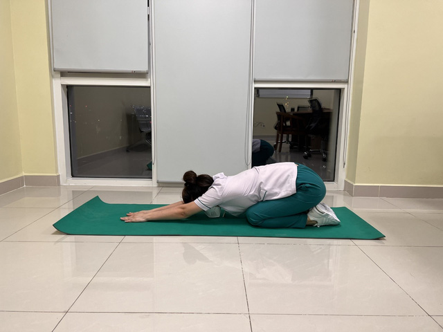 Quỳ gối lên sàn nhà, và ngồi xuống như kiểu người Nhật. Vươn người về phía trước sao cho bụng áp sát hai đùi và duỗi thẳng hai tay. Hít sâu thở đều, giữ nguyên tư thế này trong 30 giây. Động tác này giúp kéo giãn phần lưng, vai và hai bên hông của cơ thể.