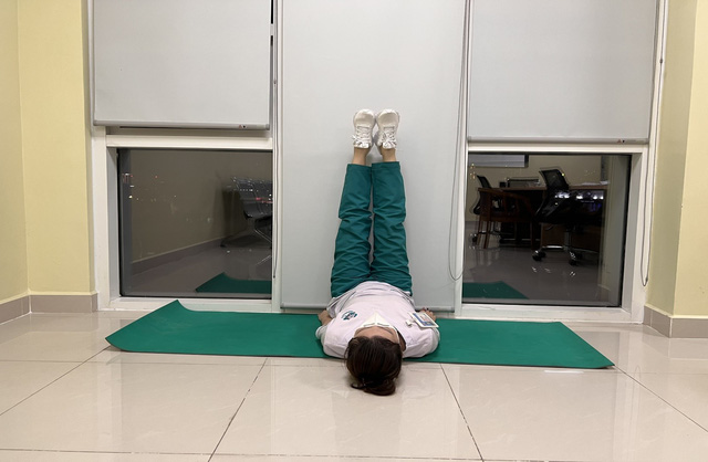 Nằm và đặt vùng hông sát bờ tường, duỗi thẳng hai chân, cố gắng sao cho khớp gối được duỗi tối đa. Nhắm mắt, thư giãn và hít sâu thở đều. Nghỉ ngơi ở tư thế này trong 5 phút. Đây là một tư thế giúp máu lưu thông dễ dàng hơn, mục đích để giảm căng thẳng sau buổi tập.