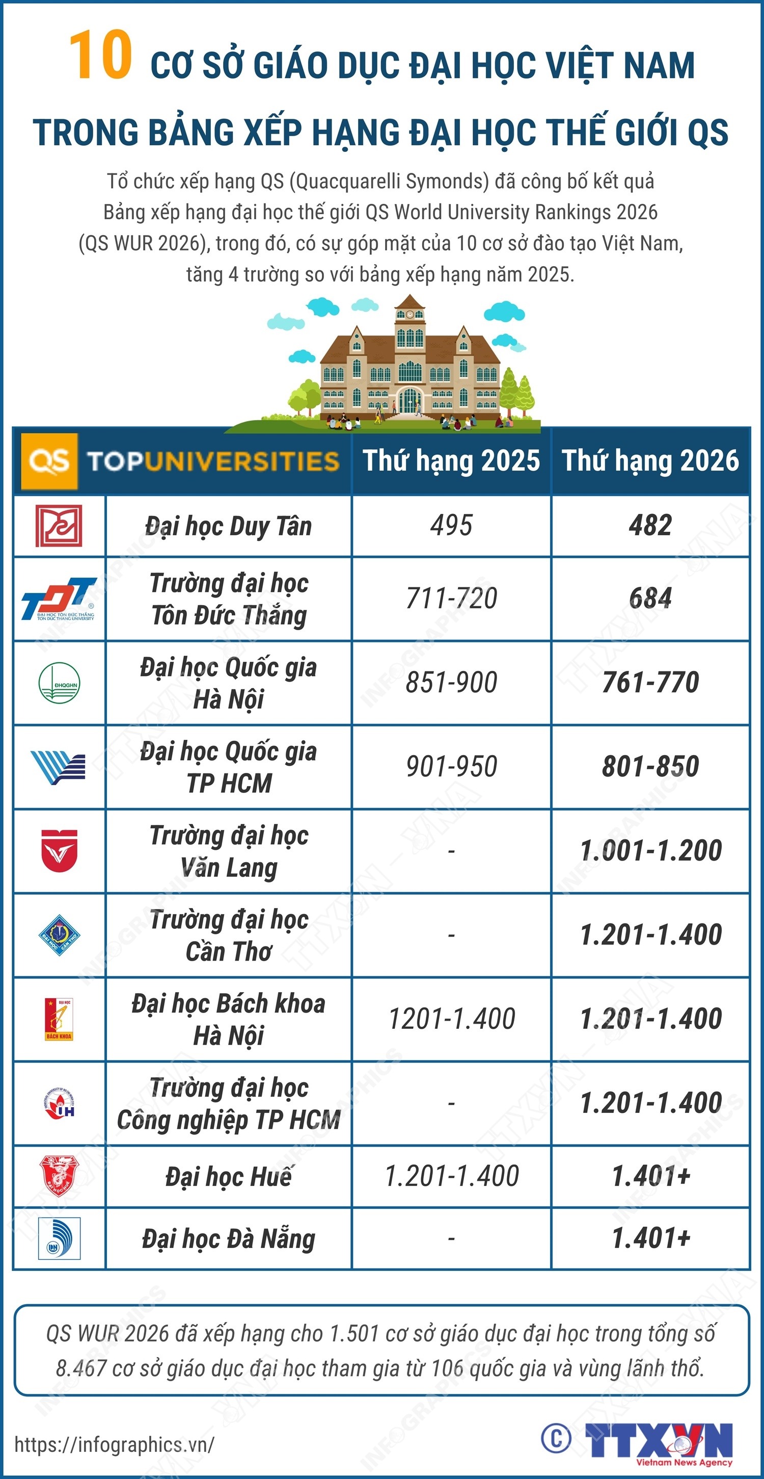 Tổ chức xếp hạng QS (Quacquarelli Symonds) ngày 19/6/2025 đã công bố kết quả Bảng xếp hạng đại học thế giới QS World University Rankings 2026 (QS WUR 2026). Việt Nam có 10 cơ sở đào tạo có mặt trong Bảng xếp hạng QS WUR 2026, tăng 4 trường so với bảng xếp hạng năm 2025.