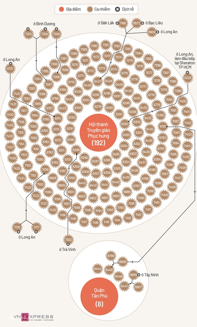 Điểm sinh hoạt Hội thánh Truyền giáo Phục hưng ở quận Gò Vấp vẫn là ổ dịch nhiều trường hợp dương tính nhất tới thời điểm này với 219 ca. "Dự báo thêm khoảng 500 ca liên quan ổ dịch Hội thánh Truyền giáo Phục hưng, vì còn nhiều F1 trong các khu cách ly tập trung", Giám đốc Sở Y tế Nguyễn Tấn Bỉnh nói.