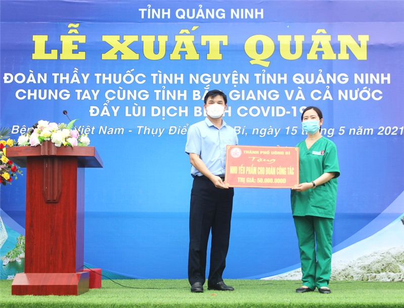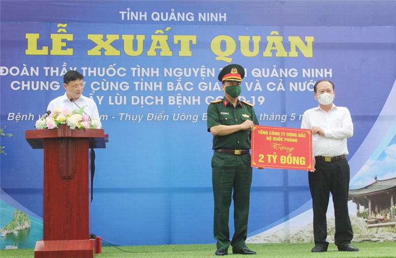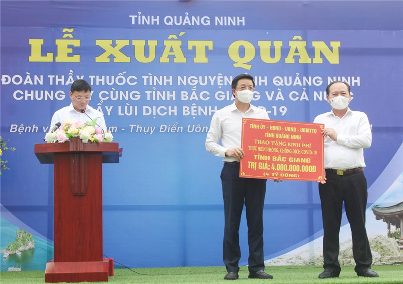 Thể hiện sự chia sẻ, đồng hành, sát cánh cùng tỉnh Bắc Giang trong cuộc chiến đẩy lùi dịch bệnh Covid-19, tỉnh Quảng Ninh đã trao ủng hộ 4 tỷ đồng cho tỉnh Bắc Giang; Tổng Công ty Đông Bắc hỗ trợ 2 tỷ đồng để góp phần cùng tỉnh bạn đẩy lùi dịch bệnh Covid-19. Cùng với đó, tỉnh Quảng Ninh tặng 200 triệu đồng cho đoàn 200 cán bộ, y, bác sỹ Bệnh viện Việt Nam – Thụy Điển Uông Bí lên đường hỗ trợ Bắc Giang phòng, chống dịch; TP Uông Bí hỗ trợ nhu yếu phẩm trị giá 50 triệu đồng cho đoàn công tác.