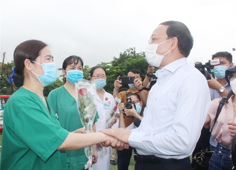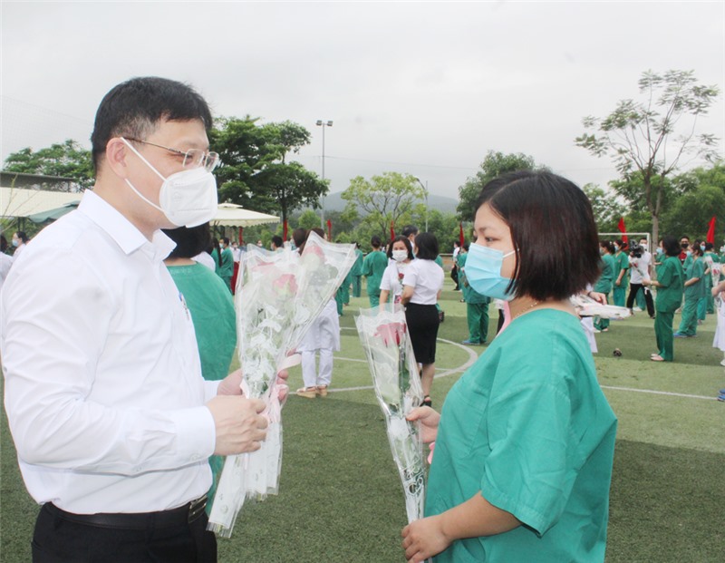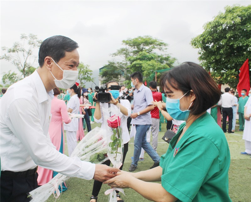 Các đồng chí lãnh đạo tỉnh, thành phố tặng hoa động viên cán bộ, y bác sỹ trước giờ lên đường làm nhiệm vụ.