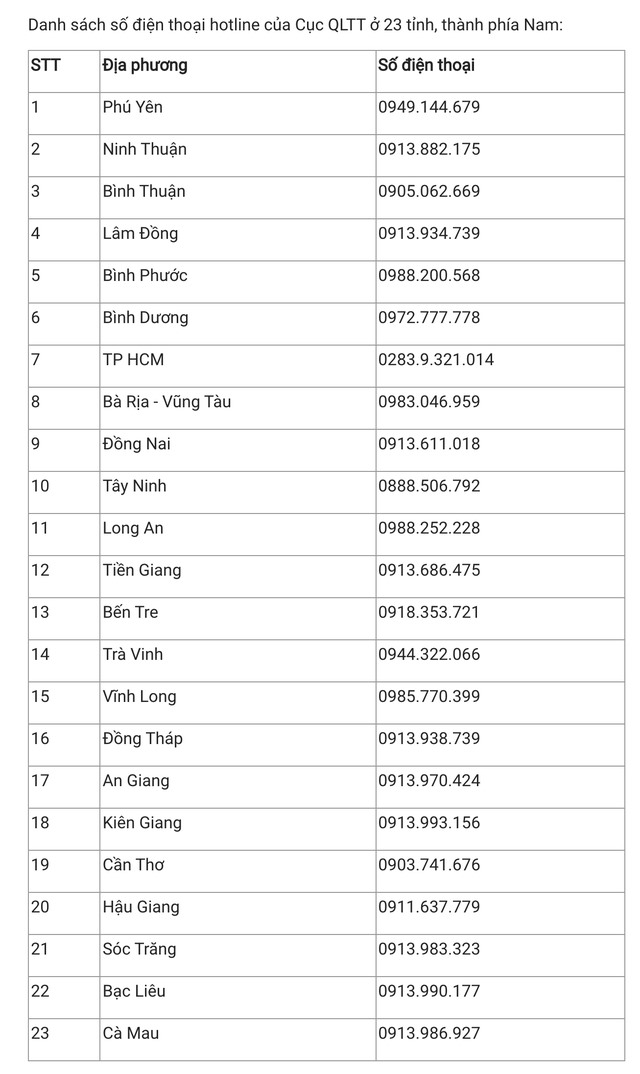 Tổng Cục Quản lý thị trường (Bộ Công Thương) vừa công khai danh sách số điện thoại đường dây nóng tại 23 tỉnh, thành phố khu vực miền Nam để tiếp nhận, xử lý và ngăn chặn các hành vi vi phạm pháp luật về giá, đặc biệt các hành vi lợi dụng dịch bệnh để gian lận thương mại, thu lời bất chính.