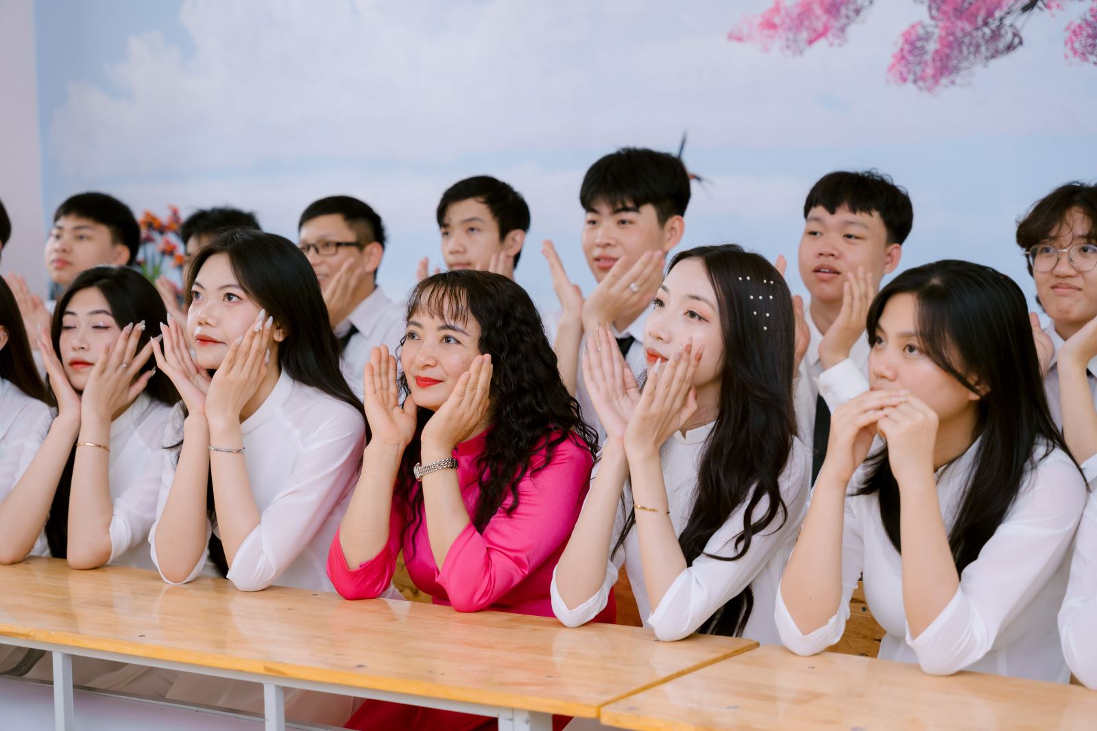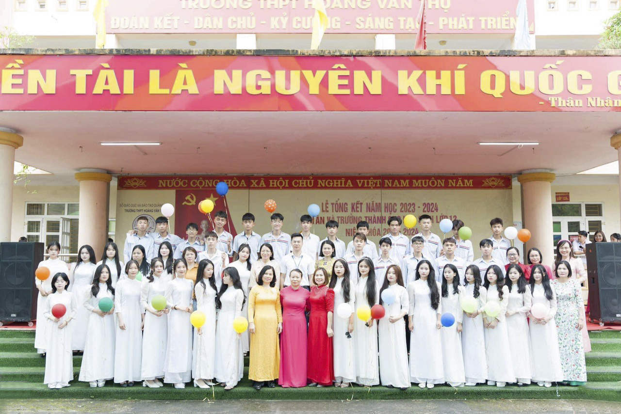 Hoc sinh 2K6 THPT Hoàng Văn Thụ chụp ảnh kỷ yếu cùng thầy cô.
