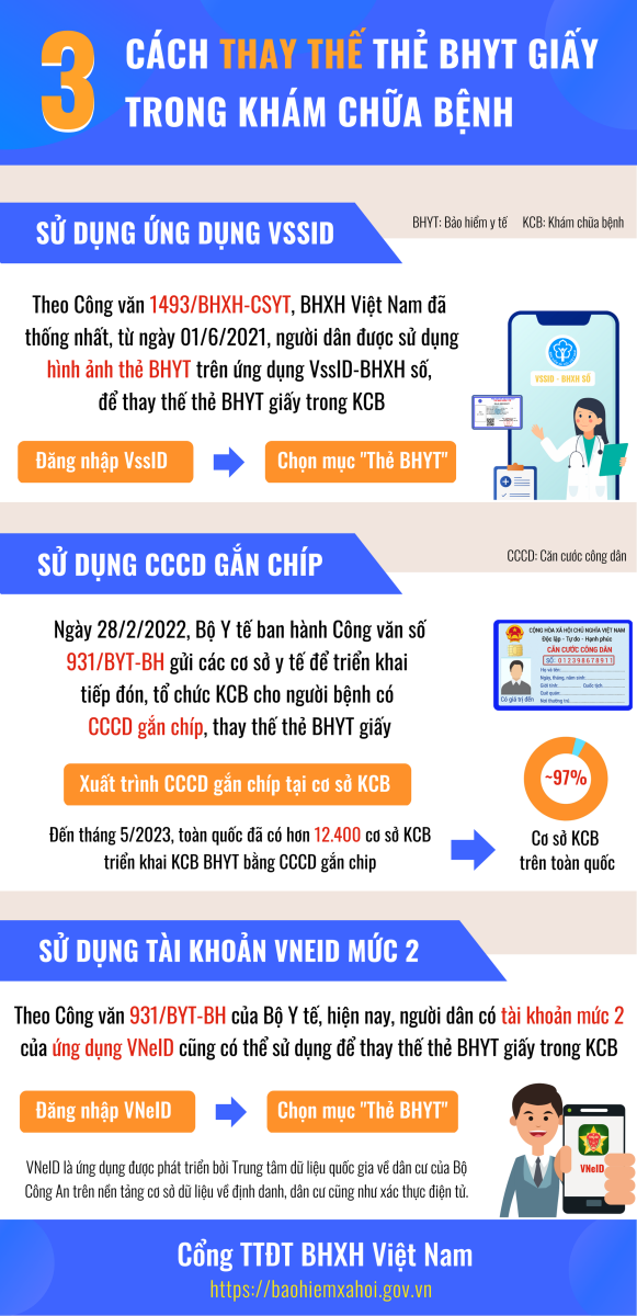 Có 3 cách thay thế thẻ bảo hiểm y tế giấy trong khám chữa bệnh, gồm: Sử dụng ứng dụng VssID; sử dụng CCCD gắn chíp; sử dụng tài khoản VNeID mức 2.
