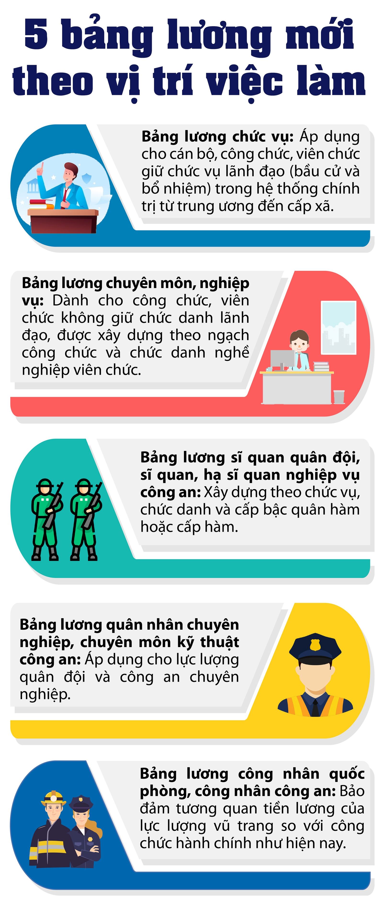 Trong đó, tại Nghị quyết 27-NQ/TW quy định việc xây dựng 5 bảng lương mới cán bộ, công chức, viên chức và lực lượng vũ trang theo vị trí việc làm, chức danh và chức vụ lãnh đạo thay thế hệ thống bảng lương hiện hành; chuyển xếp lương cũ sang lương mới, bảo đảm không thấp hơn tiền lương hiện hưởng.