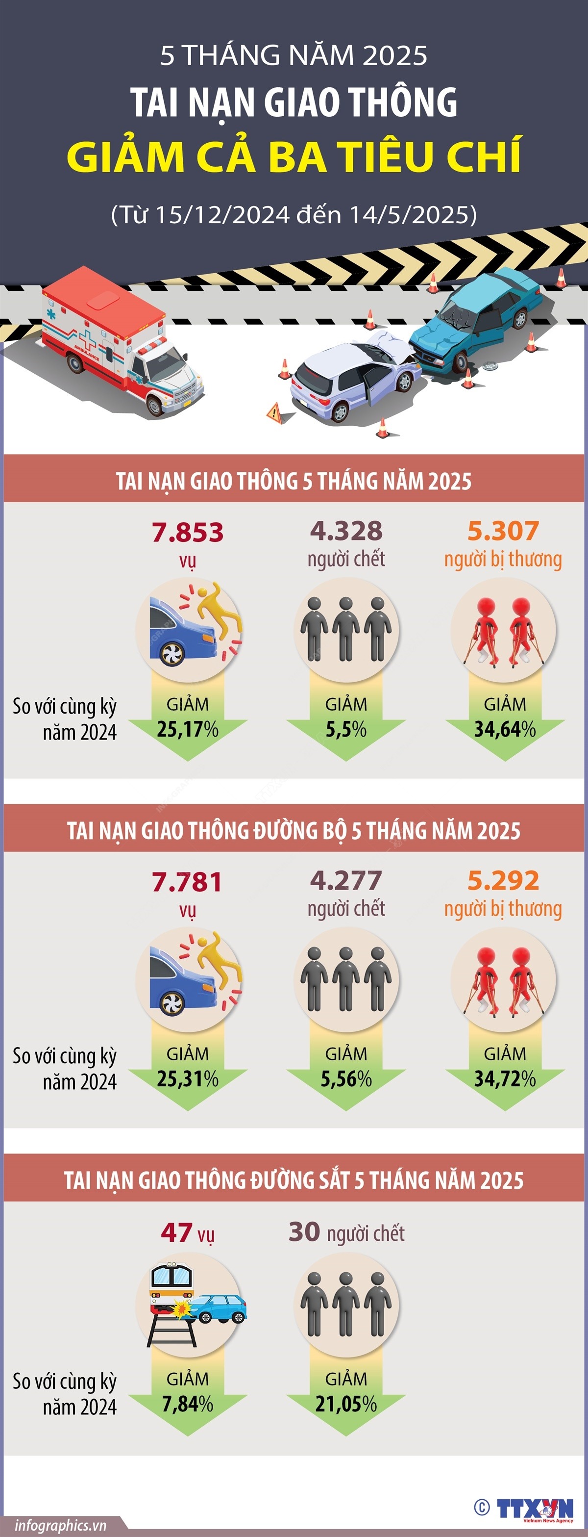 5 tháng năm 2025 (tính từ ngày 15/12/2024 đến 14/5/2025), toàn quốc xảy ra 7.853 vụ tai nạn giao thông, giảm 2.641 vụ (25,17%), làm chết 4.328 người, giảm 252 người chết (5,5%) và bị thương 5.307 người, giảm 2.813 người bị thương (34,64%) so với 5 tháng năm 2024.
