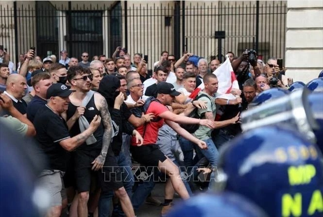 Người biểu tình phản đối nhập cư bất hợp pháp sau vụ tấn công bằng dao ở Southport xung đột với cảnh sát ở London, Anh ngày 31/7/2024. Ảnh: REUTERS/TTXVN