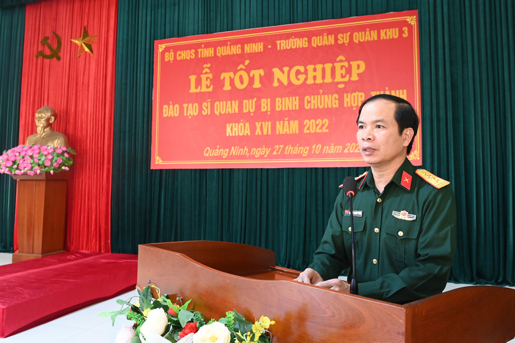 Phát biểu tại Lễ tốt nghiệp, Đại tá Nguyễn Quang Hiến, Phó Bí thư Thường trực Đảng ủy, Chính ủy Bộ CHQS tỉnh Quảng Ninh ghi nhận và biểu dương đội ngũ cán bộ, giáo viên, học viên đã phát huy tinh thần, trách nhiệm, chủ động khắc phục khó khăn hoàn thành xuất sắc nhiệm vụ khóa học. Đồng chí đề nghị, sau Lễ tốt nghiệp, các đồng chí sĩ SQDB khi trở về địa phương tiếp tục nỗ lực, phấn đấu hoàn thành xuất sắc nhiệm vụ của người SQDB; thường xuyên tu dưỡng, rèn luyện, nâng cao ý thức trách nhiệm trong thực hiện đường lối, chủ trương của Đảng, chính sách pháp luật Nhà nước; nhiệm vụ quốc phòng, quân sự địa phương nói chung, đặc biệt nhiệm vụ động viên, huấn luyện quân nhân dự bị. Chấp hành nghiêm các quy định về công tác đăng ký, quản lý, tuyên truyền, giáo dục cho quân nhân dự bị thuộc quyền; định kỳ duy trì, nâng cao chất lượng sinh hoạt, hoàn thành tốt nhiệm vụ kiểm tra động viên và huấn luyện hằng năm. Nêu cao ý thức tổ chức kỷ luật, tinh thần cảnh giác cách mạng, sẵn sàng nhận và hoàn thành nhiệm vụ khi có lệnh động viên kiểm tra, huấn luyện và bổ sung cho Quân đội khi cần thiết... Tích cực tham gia các hoạt động phong trào ở địa phương, nhất là phong trào "Quân đội chung sức xây dựng nông thôn mới"...