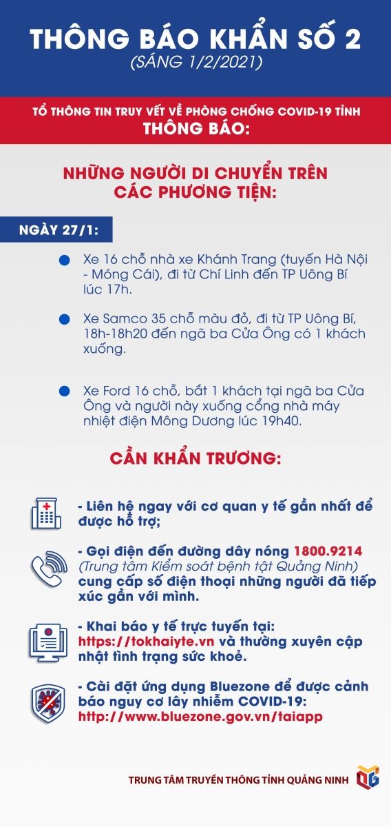 Tổ thông tin truy vết về phòng, chống covid-19 tỉnh Quảng Ninh thông báo: