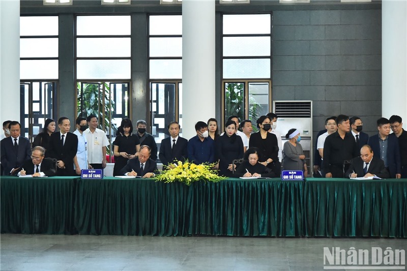 Các đồng chí lãnh đạo, nguyên lãnh đạo Đảng, Nhà nước ghi sổ tang tưởng nhớ đồng chí Nguyễn Khánh tại lễ viếng.