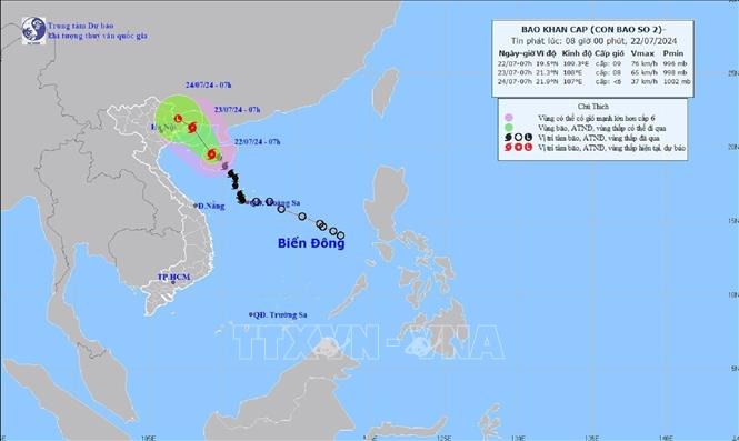 Hồi 10 giờ ngày 22/7, vị trí tâm bão ở vào khoảng 19,8 độ Vĩ Bắc; 109,0 độ Kinh Đông, trên vùng biển phía đông của khu vực Bắc vịnh Bắc Bộ, cách Bạch Long Vĩ khoảng 150 km về phía đông nam. Sức gió mạnh nhất vùng gần tâm bão mạnh cấp 9-10 (75-102 km/h), giật cấp 12, di chuyển theo hướng Tây Bắc với tốc độ 10-15 km/h.