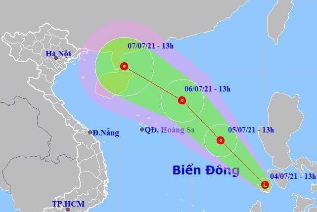 Văn bản nêu rõ, chiều ngày 04/7, trên khu vực miền Trung Philippines xuất hiện một vùng áp thấp. Hồi 13h00, vị trí trung tâm vùng áp thấp ở vào khoảng 12,0-13,0 độ vĩ Bắc; 119,5-120,5 độ kinh Đông. Dự báo trong 24 giờ tới, vùng áp thấp di chuyển theo hướng Tây Bắc và có khả năng mạnh lên thành áp thấp nhiệt đới, gây gió mạnh cấp 6, giật cấp 8.