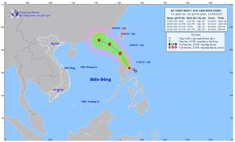 Theo Trung tâm Dự báo khí tượng thủy văn quốc gia, hồi 1 giờ ngày 17/9, vị trí tâm áp thấp nhiệt đới ở khoảng 16 độ vĩ bắc; 122,3 độ kinh đông, trên vùng biển phía đông đảo Lu-Dông (Philippines).