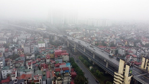 Đường Phạm Văn Đồng mờ ảo trong thời tiết mưa phùn. (Ảnh: Huy Hùng/TTXVN)