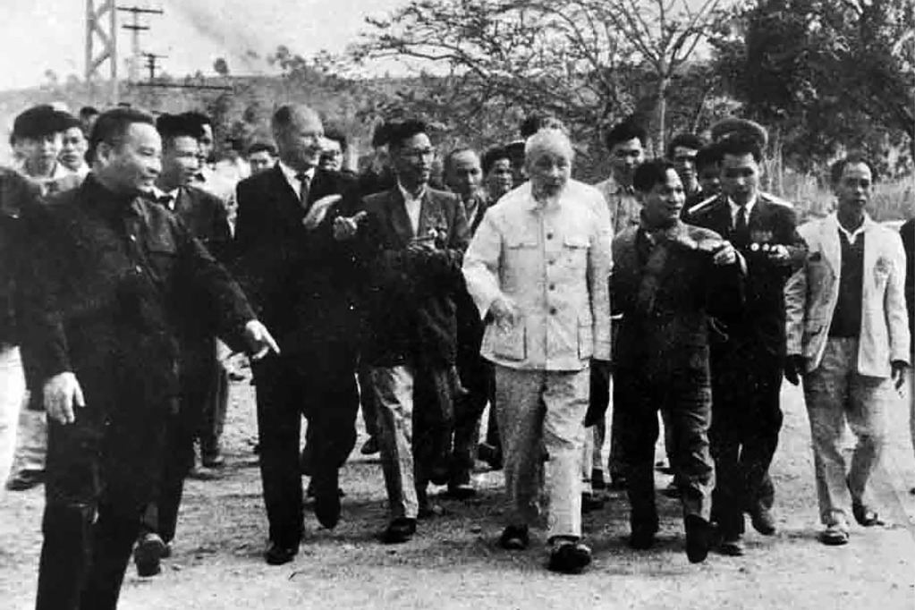 Chủ tịch Hồ Chí Minh thăm, chúc Tết nhân dân Uông Bí, công nhân Công trường xây dựng Nhà máy Điện Uông Bí, mỏ than Vàng Danh ngày 2/2/1965 (mồng 1 Tết Ất Tỵ). Ảnh tư liệu