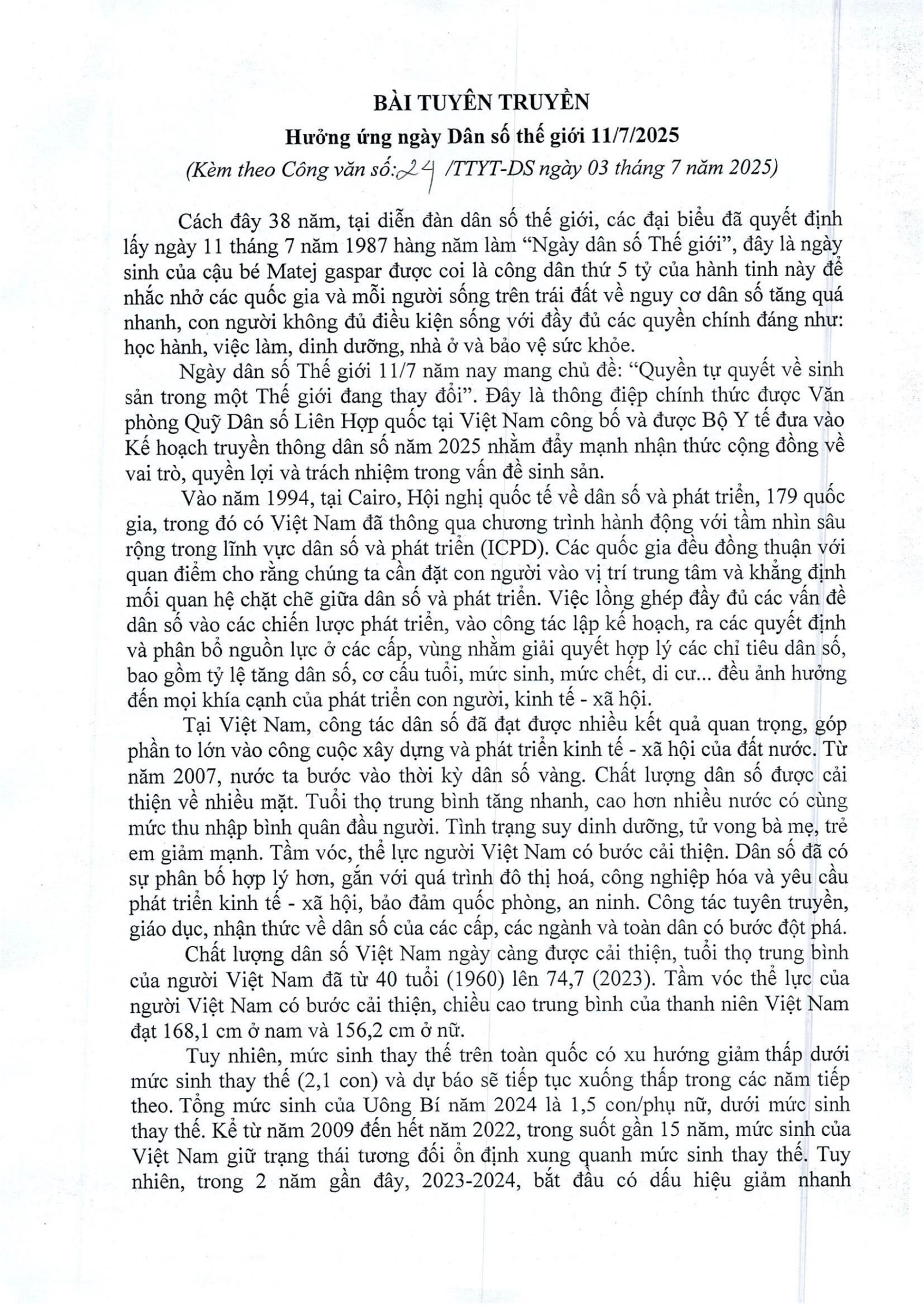 Bài tuyên truyền hưởng ứng ngày Dân số thế giới 11/7