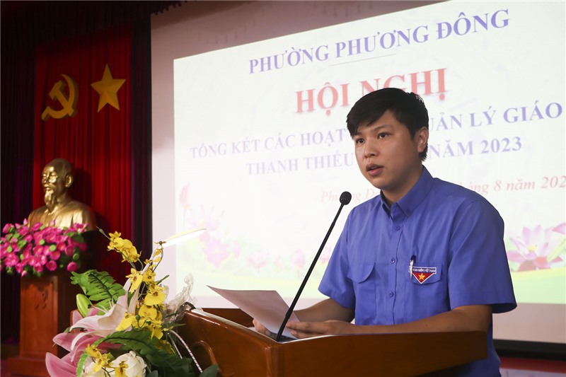 Đồng chí Bí thư Đoàn thanh niên phường báo cáo công tác Quản lý giáo dục Thanh thiếu nhi hè năm 2023.