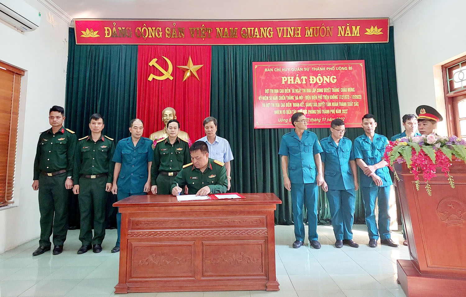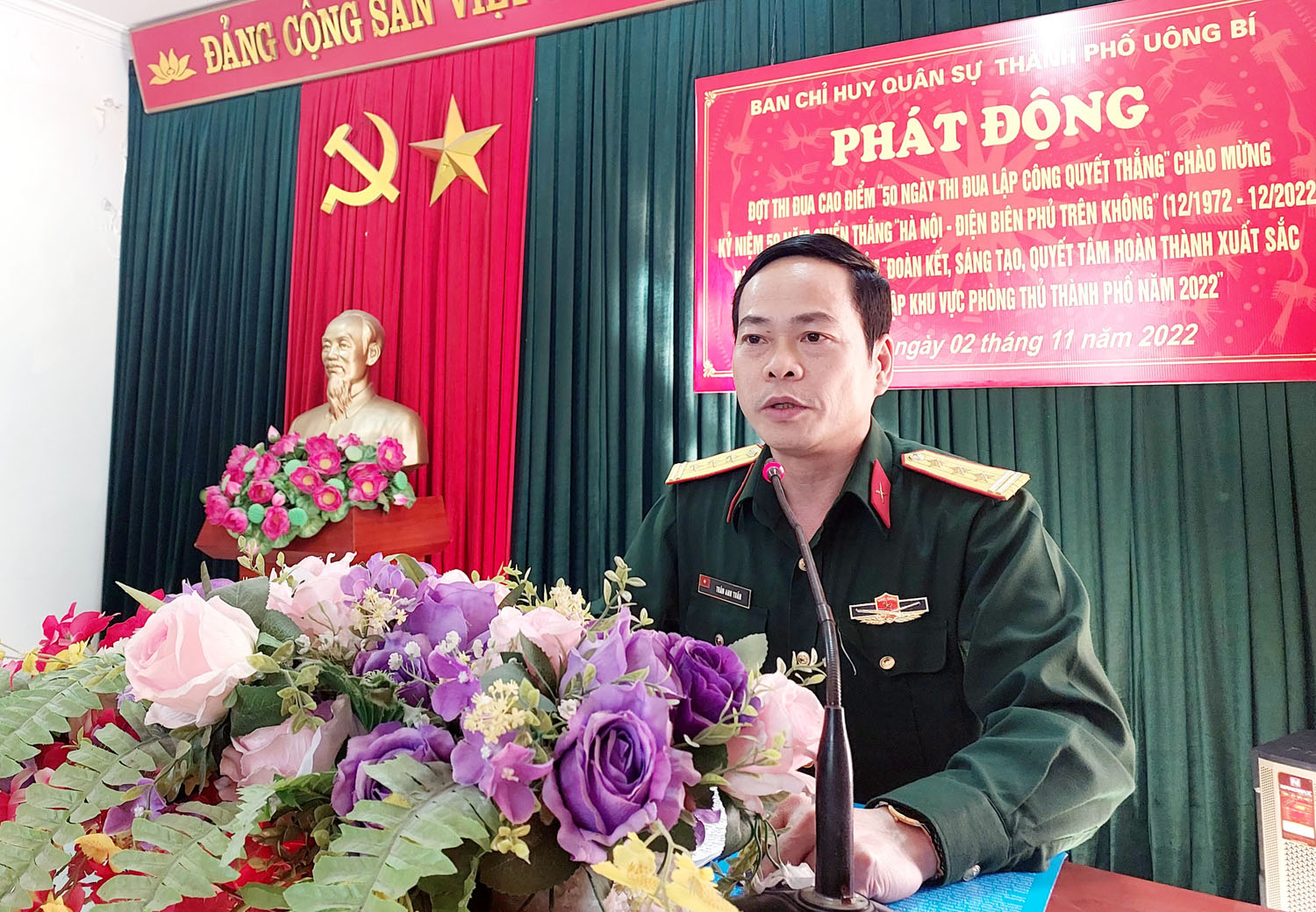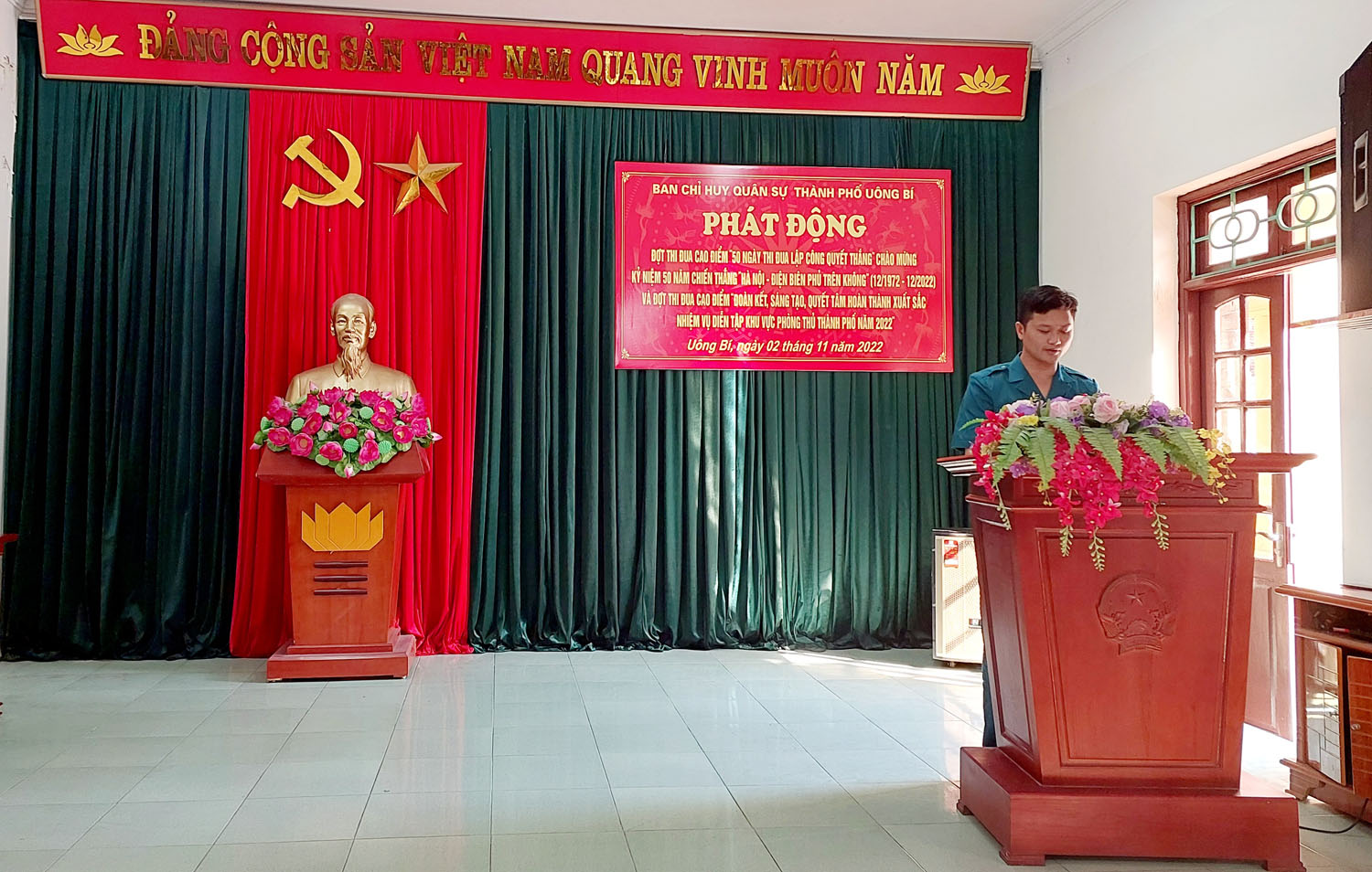 Chiều ngày 2/11, Ban CHQS thành phố Uông Bí tổ chức phát động đợt thi đua cao điểm “50 ngày thi đua lập công quyết thắng” chào mừng kỷ niệm 50 năm Chiến thắng “Hà Nội - Điện Biên phủ trên không” (12/1972 - 12/2022) và đợt thi đua cao điểm “đoàn kết, sáng tạo, quyết tâm hoàn thành xuất sắc nhiệm vụ diễn tập KVPT thành phố năm 2022”. Tới dự lễ phát động có đồng chí Nguyễn Văn Thành, UVBTV Thành uỷ, Phó Chủ tịch Thường trực UBND thành phố.