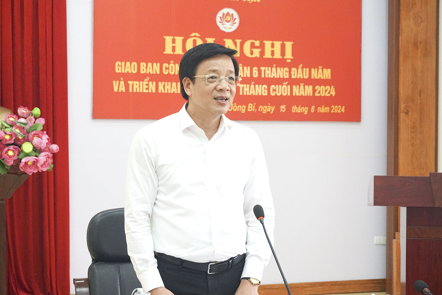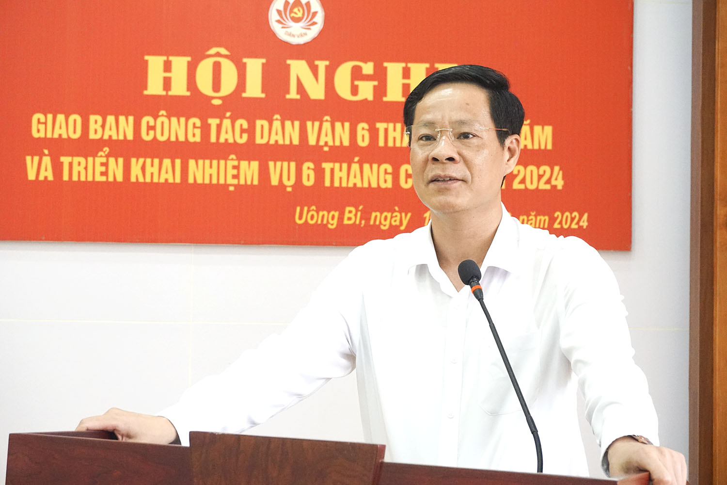 Phát biểu kết luận hội nghị, đồng chí Nguyễn Văn Hồi, Uỷ viên BTV, Trưởng Ban Dân vận Tỉnh ủy, Chủ tịch Ủy ban MTTQ tỉnh nhấn mạnh để hoàn thành các chương trình, nhiệm vụ công tác dân vận năm 2024, trong 6 tháng cuối năm, Ban Dân vận các cấp cần tiếp tục chủ động đề xuất, tham mưu cấp ủy triển khai đầy đủ, nghiêm túc các nghị quyết, chỉ thị, kết luận, quy chế, quy định của Trung ương, của tỉnh về công tác dân vận, dân tộc, tôn giáo theo hướng thiết thực, cụ thể, sáng tạo, bám sát tình hình thực tiễn.