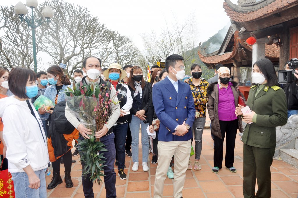 Hướng dẫn viên của Ban giới thiệu đến du khách về giá trị của Yên Tử tại chùa Hoa Yên.