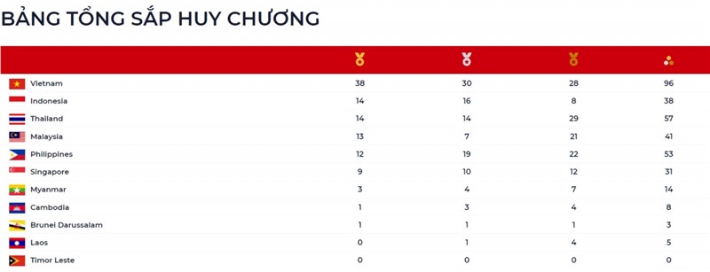 Cập nhật bảng tổng sắp huy chương SEA Games 31 mới nhất, tính đến 5h30 sáng ngày 15/5, Đoàn Thể thao Việt Nam dẫn đầu khi có đến 38 HCV. Trong khi đó, Indonesia đã vươn lên vị trí thứ 2.
