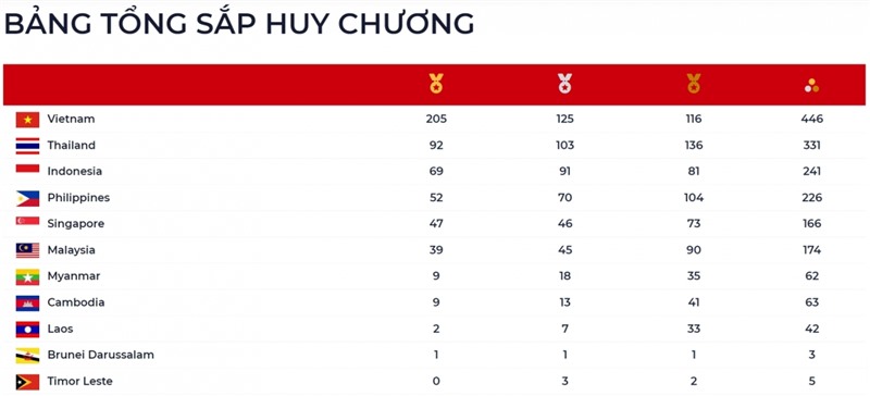 Kết thúc SEA Games 31, Đoàn Thể thao Việt Nam đứng nhất toàn đoàn với tổng cộng 205 HCV, 125 HCB, 116 HCĐ. Thành tích này giúp Đoàn Thể thao Việt Nam lập kỷ lục về số HCV ở một kỳ SEA Games, phá vỡ kỷ lục 194 HCV mà Indonesia lập được vào năm 1997.