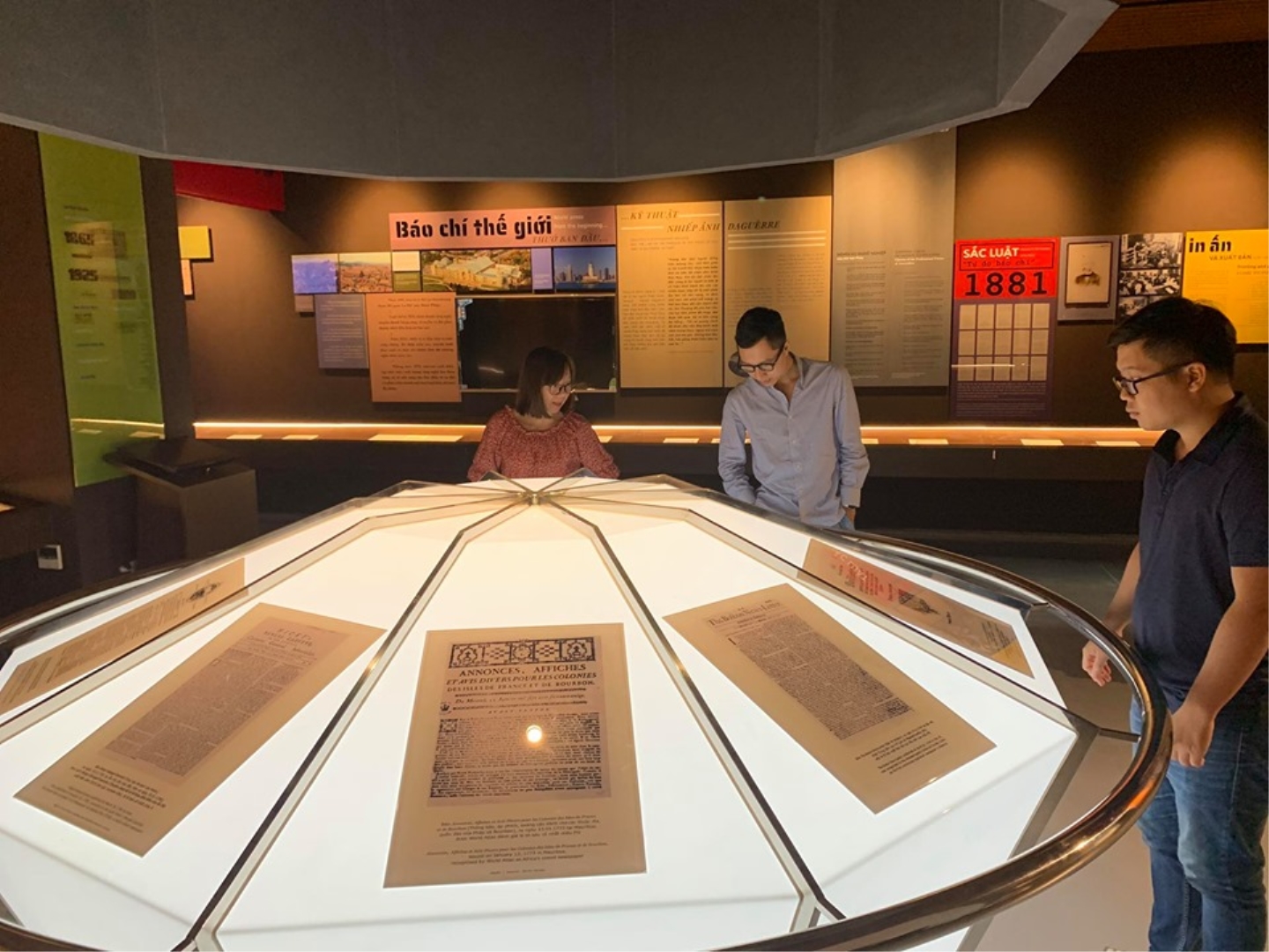 Kệ kim cương tại Bảo tàng Báo chí Việt Nam, trưng bày 8 tờ báo được Hiệp hội Báo chí Thế giới xếp hạng cổ nhất trên thế giới và 2 tờ báo của Việt Nam. Trong đó, 2 tờ báo của Việt Nam là tờ Gia Định Báo - tờ báo đầu tiên xuất bản bằng chữ Quốc ngữ và Báo Thanh niên - tờ báo cách mạng đầu tiên của Việt Nam. Ảnh: Hiền Anh