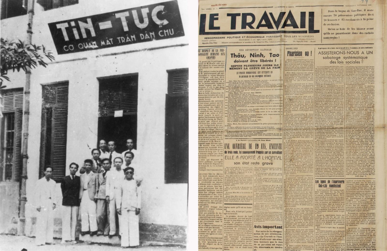 Các nhà báo Trường Chinh, Trần Huy Liệu, Trần Đình Long... tại trụ sở báo Tin tức ở Hà Nội, năm 1938 (ảnh trái) và báo Le Travail số ra ngày 6-11-1936