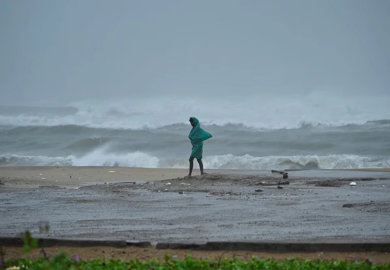 Một người đi dọc bãi biển Neelankarai trong lúc thủy triều lên cao trước khi cơn bão Fengal tiến gần đến Chennai, Ấn Độ. Ảnh: Reuters.