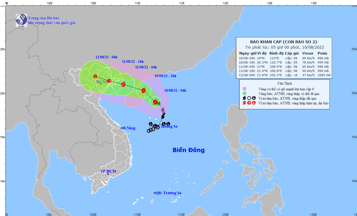 Hồi 4 giờ ngày 10/8, vị trí tâm bão ở vào khoảng 19,0 độ Vĩ Bắc; 112,0 độ Kinh Đông, cách đảo Hải Nam (Trung Quốc) khoảng 160km về phía Đông. Sức gió mạnh nhất vùng gần tâm bão mạnh cấp 8 (62-74km/giờ), giật cấp 10. Bán kính gió mạnh cấp 6, giật cấp 8 khoảng 110km tính từ tâm bão.