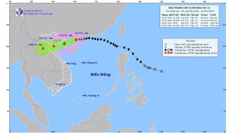 Sáng 21/7, bão số 3 di chuyển theo hướng tây tây nam, tốc độ khoảng 15-20km/giờ, chỉ còn cách Quảng Ninh-Hải Phòng khoảng 233km về phía đông. Dự báo chiều tối nay, bão sẽ vào vịnh Bắc Bộ; vùng ven biển từ Quảng Ninh đến Nghệ An có gió mạnh dần lên cấp 7-9; đồng bằng Bắc Bộ, Thanh Hóa và Nghệ An có mưa rất to và dông.
