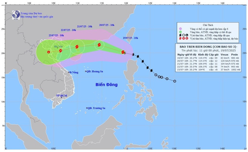 Bản đồ dự báo quỹ đạo và cường độ Bão số 3 phát lúc 11 giờ ngày 19/7/2025. (Ảnh: Trung tâm Dự báo khí tượng thủy văn quốc gia)
