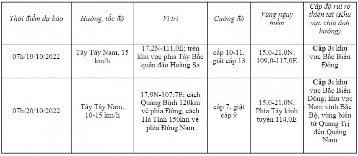 - Khu vực Bắc Biển Đông (bao gồm cả vùng biển quần đảo Hoàng Sa) có mưa bão, gió mạnh cấp 9-10, vùng gần tâm bão mạnh cấp 12-13, giật cấp 15. Biển động dữ dội.
