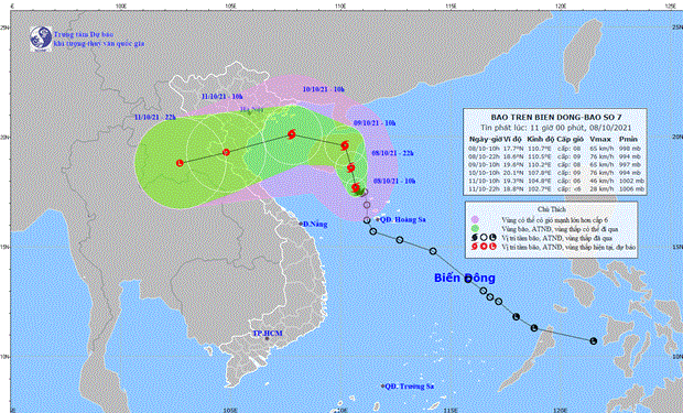 Theo Trung tâm Dự báo Khí tượng Thủy văn Quốc gia, hồi 10 giờ ngày 8/10, tâm bão số 7 ở vào khoảng 17,7 độ Vĩ Bắc; 110,7 độ Kinh Đông, cách đảo Hải Nam (Trung Quốc) khoảng 130km về phía Nam Đông Nam.