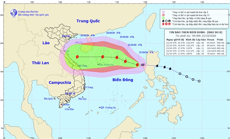 Trung tâm Dự báo khí tượng thủy văn quốc gia cho biết, hồi 07h ngày (21/10), vị trí tâm bão ở khoảng 16,2 độ Vĩ Bắc; 118,6 độ Kinh Đông, cách quần đảo Hoàng Sa khoảng 680 km về phía Đông Đông Nam. Sức gió mạnh nhất vùng gần tâm bão mạnh cấp 8 (60-75 km/h), giật cấp 10.