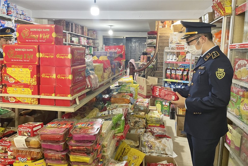 Đội QLTT số 3 (TP Cẩm Phả) kiểm tra bao bì hàng hóa tại chợ Cẩm Đông.