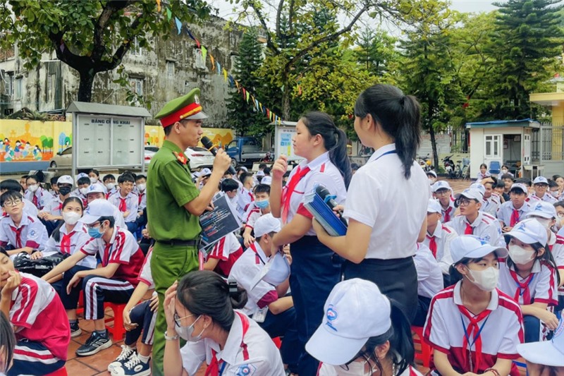 Công an phường Cửa Ông (TP Cẩm Phả) phối hợp tuyên truyền, phổ biến giáo dục kiến thức pháp luật tại trường học. Ảnh: CTV