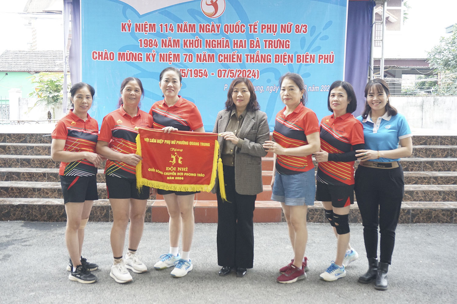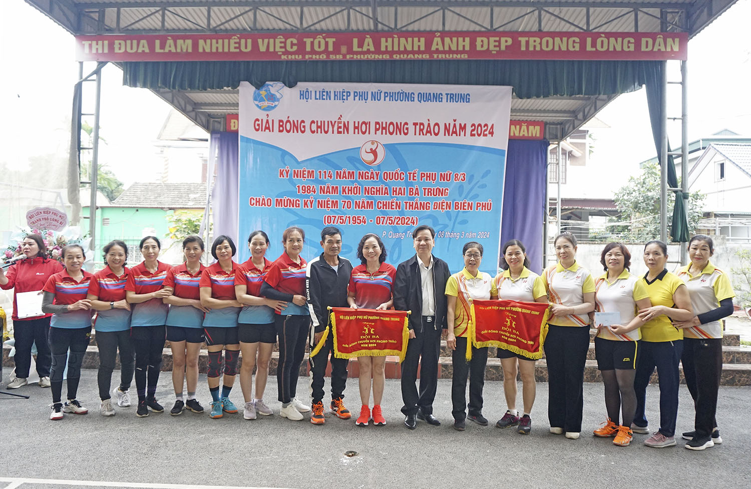 Sau 1 ngày tranh tài sôi nổi, chiều 8/3, Hội LHPN phường Quang Trung tổ chức bế mạc và trao Giải Bóng chuyền hơi phong trào kỷ niệm 114 năm Ngày Quốc tế phụ nữ 8/3, 1984 năm cuộc khởi nghĩa hai Bà Trưng, 70 năm chiến thắng Điện Biên Phủ 07/5 (1954-2024).