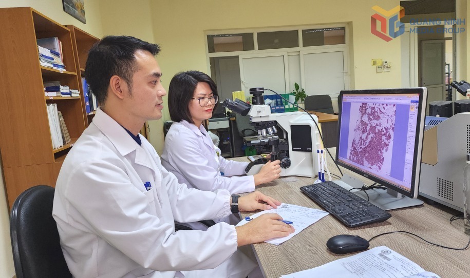 Bác sĩ thực hiện phân tích tiêu bản mô bệnh học trên hệ thống hiển vi và phần mềm hỗ trợ tại Bệnh viện Việt Nam-Thụy Điển Uông Bí.