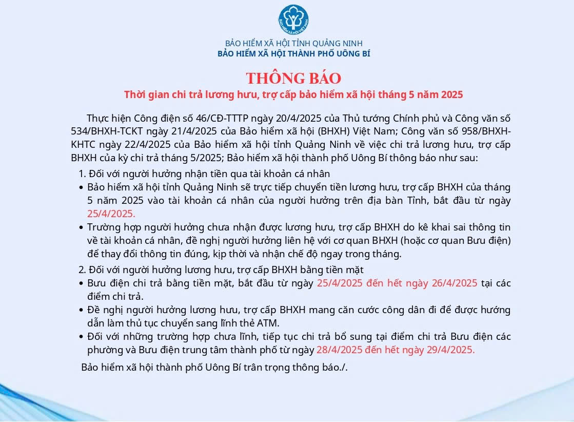 BHXH TP Uông Bí thông báo thời gian chi trả lương hưu, trợ cấp BHXH tháng 5 năm 2025