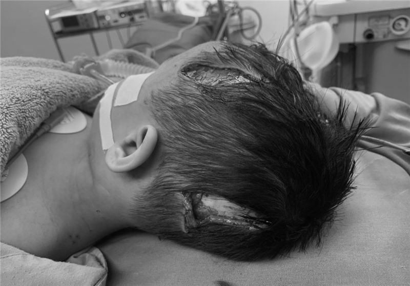 Bé nhập viện với nhiều vết thương lóc da đầu, lộ xương sọ, chảy nhiều máu. Trên hình ảnh chụp CT.Scanner cho thấy có vỡ xương chẩm phải, tụ máu thái dương phải. Nhanh chóng bệnh nhi được làm các xét nghiệm cần thiết và chuyển phòng phẫu thuật để xử trí vết thương.
