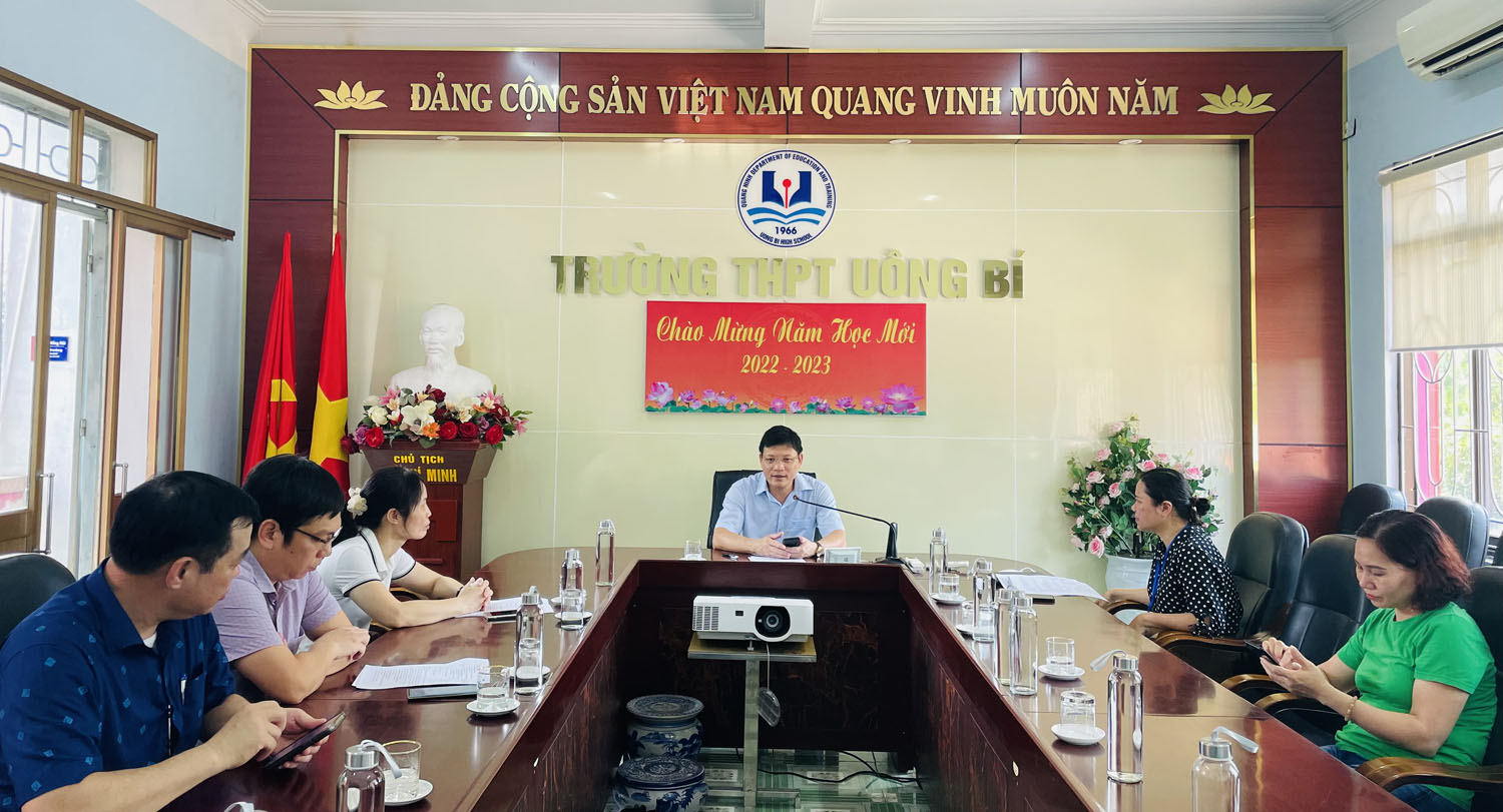 Bí thư Thành uỷ, Chủ tịch HĐND thành phố nghe lãnh đạo Trường THPT Uông Bí báo cáo về chương trình khai giảng năm học mới.